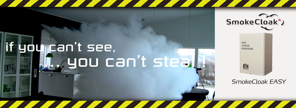 Working on the basis that, if the criminal can’t see it, he won’t be able to steal it...Smokecloak quickly fills the area, large or small, with a dense fog created by vaporising a specially formulated Glycol solution and thus reducing visibility to nil! Once the emergency has been dealt with, the ‘fog’ disperses without any damage to stock, office equipment, furnishings, fabrics or personnel.